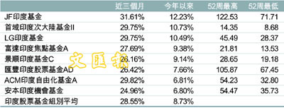 佔近今年以來榜首的JF印度基金,在2003、2004及2005年表現分別為105.2%、29.64%及42.78%,基金最差季度收益和標準差為-21.92%及24.31。行業分佈為100%消費用品。