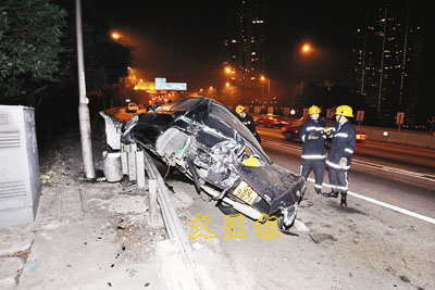 昨凌晨1時40分左右,肇事私家車由男子朱×昌(34歲)駕駛,載著兩名分別27歲及28歲的男乘客,沿屯門龍鼓灘路向屯門市中心行駛,當至青山發電廠對開時,司機發覺手機跌下座位,於是俯身撿拾,豈料一心未能二用,車輛突失控剷上行人路,擦過一棵樹後,再衝前5米,車頭撼中另一棵大樹始停下。