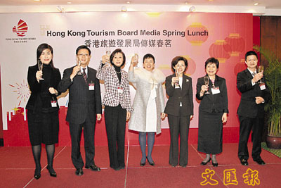 ■周梁淑怡(中)於旅發局傳媒春茗上向大家祝酒。