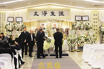 ■靈堂佈置以白色及簡潔為主,正中央則寫有「往生淨土」四字。本報記者劉國權 攝