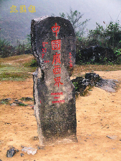 ■德天瀑布上游的中越邊境53號界碑,是清朝政府於1896年所立。筆者腳下便是越南境地。