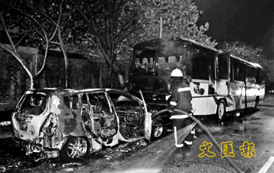 ■私家車遭縱火焚毀,波及前面一輛旅遊巴士。