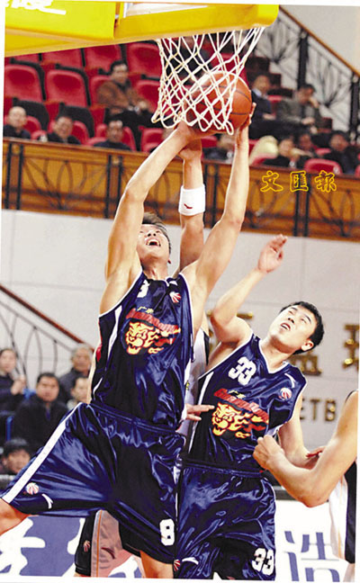 ■廣東寶瑪仕隊球員朱芳雨(左)在比賽中進攻。 新華社