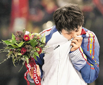 ■親吻制服上的奧運五環及五星紅旗。美聯社