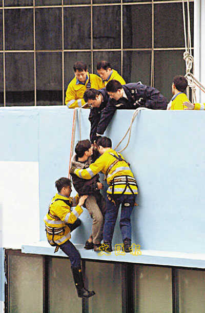 消防員及警員到場,向事主展開游說,而數名消防員則游繩在旁戒備,地下則架設氣墊,期間男子情緒激動痛哭,及後致電在家女兒,聲稱正準備跳樓,其女兒聞訊向父親哭訴,「爸爸你唔好跳樓,我今晚重要等你返來煮飯畀我食!」以軟化父親尋死念頭。當講完電話後,張已告軟化,由警署警長拉緊張的手,在旁消防員攙扶返回室內,再送院檢查,事件擾攘個多小時結束。