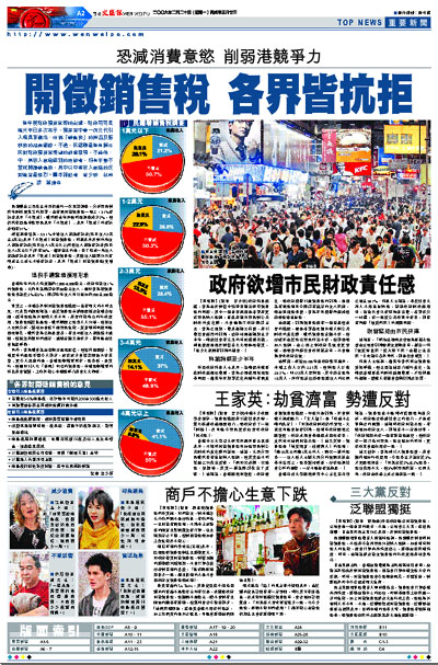 新年度財政預算案即將出爐,財政司司長唐英年已多次表示,預算案中會一併交代引入極具爭議性、俗稱「銷售稅」的商品及服務稅的諮詢細節。不過,民建聯最新有關市民對財政預算案期望的調查發現,不論低、中、高收入家庭組別的被訪者,均有半數不贊成開徵銷售稅,其中以中等收入家庭的反對聲音最強烈。