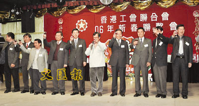 ■工聯會新春酒會,中聯辦副主任彭清華;工聯會會長鄭耀棠、理事長黃國健,副理事長梁富華、譚耀宗等在台上祝酒。本報記者劉國權 攝