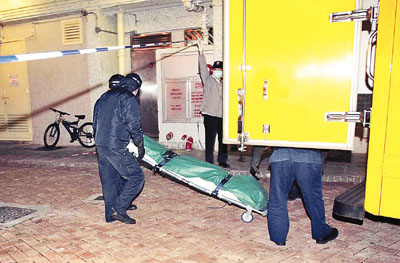 ■粉嶺華明墮樓女疑犯屍體由仵工抬走。