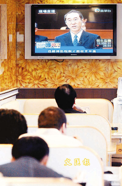 ■市民在茶餐廳收看電視播出的財政預算案新聞。本報記者李志樑 攝