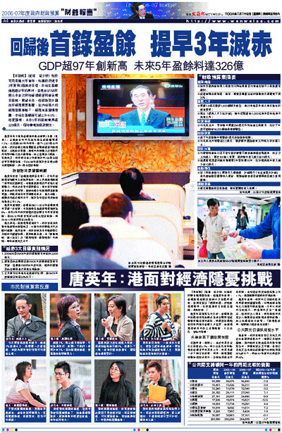 唐英年更預期,香港由2007-2010年香港經濟可望進一步發展,中期經濟名義趨勢增長預測為6%,未來5年的政府經營及綜合帳目均可取得盈餘,在06/07年度會錄得56億元綜合盈餘,到2010/11年度將增至326億元。