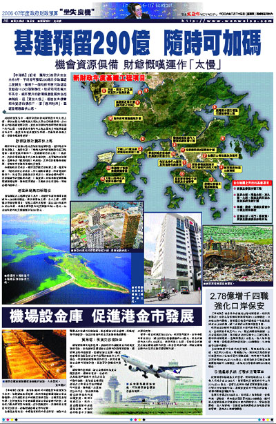 新財政預算案中,港府計劃加快開展策劃中的大型工程,涉及98億元的港珠澳大橋北大嶼山公路連接路,及49億元的添馬艦發展計劃,更會加快展開兩個前市政局遺留下來的工程,以確保未來數年的工務工程開支可維持在穩定的水平。唐英年昨發表預算案時稱,盡速完成基建工程,有助本港經濟發展。