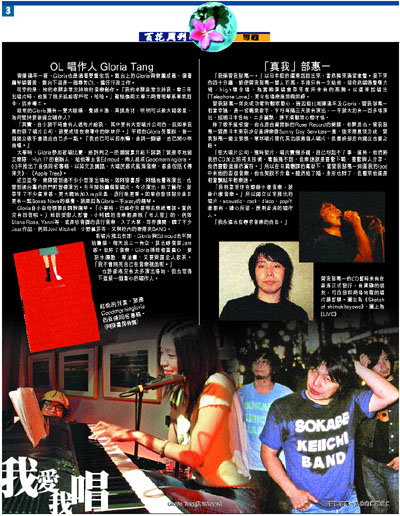 「其實,自小就不時會有人遞咭片給我, 其中更有大型唱片公司的,但如果我真的簽了唱片公司,就變成現在樂壇中的妹妹仔。」年輕的Gloria笑著說,做一個獨立歌手會適合自己多一點。「我自己可以控制嘛,曲詞一腳踼,自己開心咪得囉。」