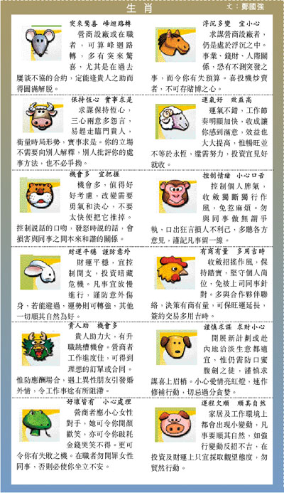 家居及工作環境上都會出現小變動,凡事要順其自然,如強行變動反招不吉,在投資及財運上只宜採取觀望態度,勿貿然行動。
