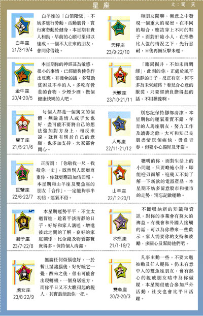 本星期你的神經甚為敏感,很小的事情,已經能夠使你作出反應。有機會的話,多幫助貧困及不幸的人。多吃有營養的食物,少煙少酒,做個健康快樂的人吧。