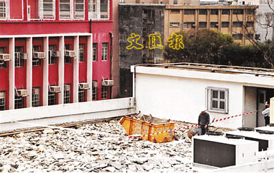 ■南華中學發生工人被吊斗擊斃的天台。 小圖為慘遭大鐵斗撞中胸部昏迷送院的工人。