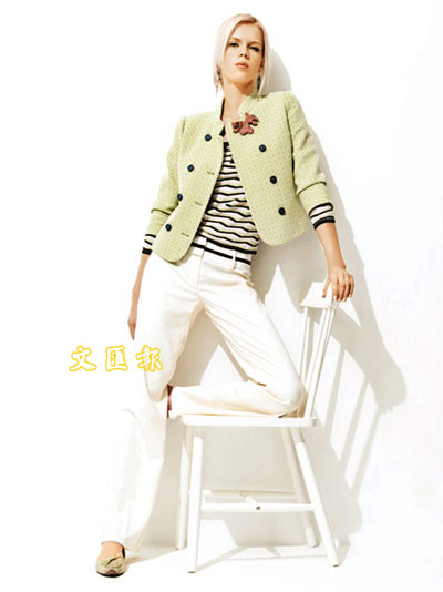 粉綠色外套內裡是橫間衫,配以純白長褲,清新自然。