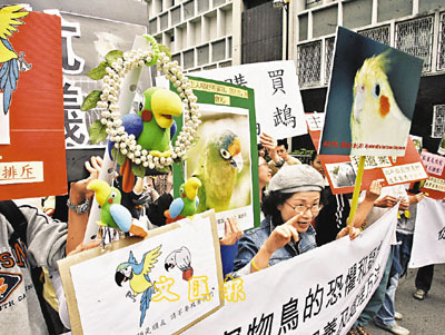 雀鳥禽畜權益籌委會救救寵物大聯盟昨日聯同香港鸚鵡會、香港賽鴿俱樂部及數十名散養家禽戶,約100人先在中環愛丁堡廣場集合,至早上11時許結隊遊行至政府總部,期間有多名散養家禽戶手舉橫額,高呼「殺雞無罪,養雞有罪」的口號,後由警方代表接收請願信後,遊行人士接著和平散去。