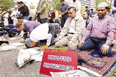 【本報訊】(記者 陳朗昇)逾2000名以華裔及印尼人為主的伊斯蘭教徒,昨天在遮打花園集會靜坐,抗議西方報章刊載侮辱伊斯蘭教先知穆罕默德漫畫。有澳洲籍女教師自製標語,支持伊斯蘭教徒抗爭,也有本地華籍伊斯蘭教徒出動一家大小、還帶領學生到場聲援。主辦團體表示,這次靜坐是抗議辱教漫畫事件是本港的最後一波,相信表達不滿聲音已足夠。