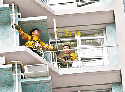 ■消防員游繩而下展開遊說。