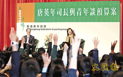 ■唐英年就財政預算案和學生談話。 本報記者張立新 攝