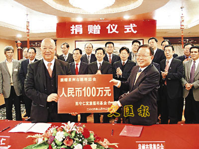 ■香港泉州慈善促進會主席陳守仁(左)代表陳守仁家族福利基金會向泉州市慈善總會捐贈100萬元人民幣。 本報記者林志鴻 攝