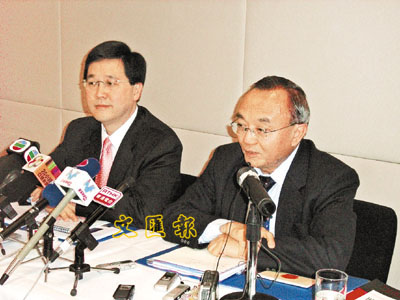 ■林瑞麟(左)表示,現階段只是凝聚各界意見,他亦重申政府未有具體普選模式方案。右為中策組首席顧問劉兆佳。本報記者曾少妍 攝