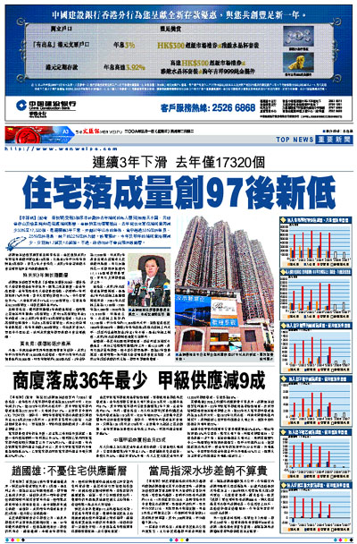 差餉物業估價署昨發表《香港物業報告2006》。報告指私人住宅售價在去年初急升,經第二季鞏固後,在去年底回落。去年第四季私人住宅售價指數,仍較前一年同期錄得7%的升幅,當中大型單位樓價升11%,中小型單位升7%。入住量亦減少44%至17,450個單位,空置量降至63,540個單位,相當於總存量的6%。