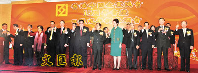 【本報訊】香港中國企業協會15周年會慶暨丙戌年新春酒會昨日傍晚假金鐘萬豪酒店舉行,行政長官曾蔭權、中聯辦主任高祀仁、副主任郭莉、鄭坤生、外交部駐港特派員公署副特派員解曉岩、財政司司長唐英年、立法會主席范徐麗泰蒞臨主禮,場面熱鬧。