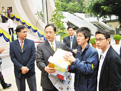 ■30多位學生於浸大50周年啟動禮場外拉橫額示威,浸大副校長李兆銓代表校方接過「請願箱」。 本報記者曾媚 攝
