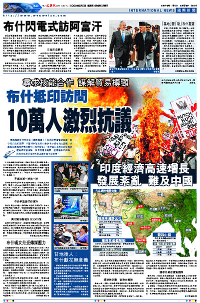 美國總統布什昨日在「旗海飄揚」下飛抵印度首都新德里,進行首次官式訪問;以穆斯林為主的10萬多名示威者走上街頭,高舉黑白旗幟和大喊口號叫「布什滾蛋」。布什此行主要目的是與印度達成核能協議,但會談還未展開,便遭逢激烈抗議,預料未來兩天布什所到之處亦將不得安寧。
