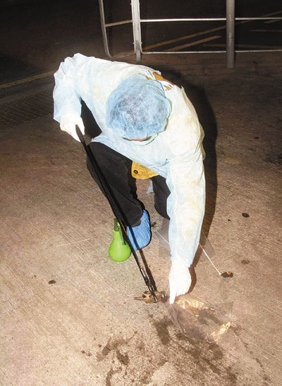 【本報訊】大角咀晏架街12號又發現死雀。昨凌晨有街坊途經上址對開行人路時,發現一隻麻雀倒斃路上,於是報案;警員到場後通知漁護署,及後漁護署人員身穿全套防護衣抵達,小心翼翼地用鐵鉗檢起麻雀,將之放入膠袋內帶走處理。