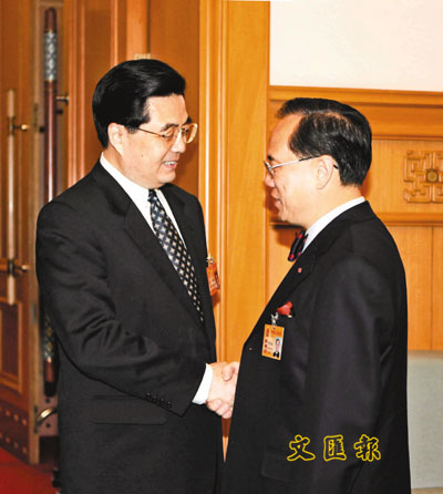 ■在人大會議開幕前的休息室內,胡錦濤與香港特區行政長官曾蔭權親切握手。新華社