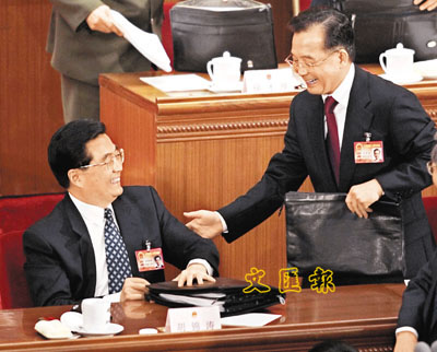 ■溫家寶總理在向大會作完政府工作報告後,返回座位時與國家主席胡錦濤交談。 美聯社