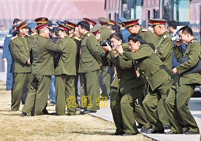 ■在天安門廣場,解放軍代表互相攝影留念。 美聯社