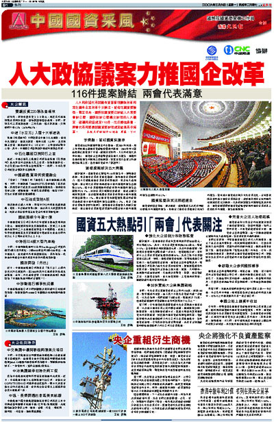 統計顯示,在國資委已辦結的116件提案中,規範國企改制,完善國有企業改革配套措施,提高國有企業競爭力、給予欠發達地區企業改革政策傾斜、完善法人治理結構,建立現代企業管理制度等方面的建議和提案佔總數32.8%;給予企業債轉股和破產政策的建議和提案佔總數的20.7%;加快企業分離辦社會進度、延長主輔分離政策期限、出台廠辦集體企業改革政策等方面的建議和提佔總數14.7%;建立國有資本經營預算體系和產權交易制度等方面的建議和提案佔總數11.2%;完善《國有企業監事會暫行條例》、規範國有企業領導人薪酬分配制度、建立國有企業經營者業績考核體系等方面的建議和提案佔總數的10.3%。