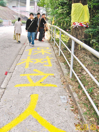 ■中大學生會校園環境關注組寫上「保樹立人」4個黃色油漆大字。 本報記者盧燕娥 攝