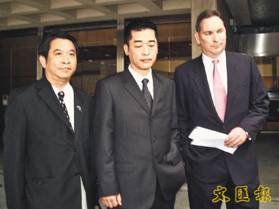 ■「無味神探」陳思祺(中)在上訴得直後與本地督察協會主席廖潔明(左)及代表律師(右)離開法庭。
