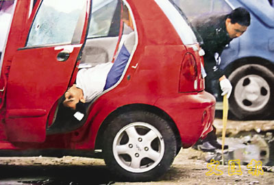 ■被擊斃的持槍悍匪倒在私家車後座,一名警方技偵人員在勘察現場。 本報深圳傳真傳真