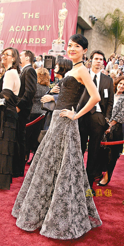 章子怡在奧斯卡金像獎頒獎禮其實可以穿得更加出色,例如上次在金球獎頒獎禮,同樣也是ARMANI,但明亮的黃色叫觀眾眼前一大亮,人人讚不絕口,出了很大的一回風頭,讓世人對華人女性有了一番新印象。但這次ARMANI的黑銀灰設計,優雅有餘,惜青春氣息不足,老了二十年。本來嬌俏的她應穿一些高頭大馬西方女性不敢隨便穿上的鮮亮顏色,得天獨厚的章小姐應利用華人獨有的挑長雅致身材,不用黑色作保護,隨便穿紅,中國人的喜慶色調,七十四歲的意大利名師ARMANI便有每季必備的大紅盛裝。