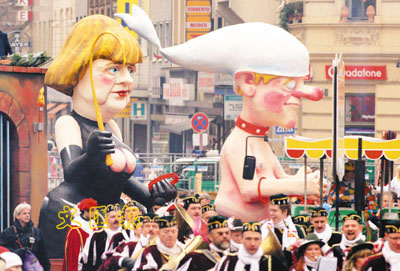 ■德國一年一度的Rose Monday巡遊嘉年華上月開鑼,要全民參與,當然包括現任總理默克爾啦,雖然佢可能唔想。 (法新社)