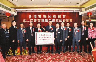 【本報訊】(記者 鄭群)香港五華同鄉總會第二屆會董就職典禮日前假油麻地聯邦大酒樓隆重舉行,梅州市政協主席魏潘堯,梅州市統戰部部長曾百友,五華縣縣委書記張光明,深圳市人大常委吳炯聲應邀蒞臨主禮。周樹菁眾望所歸蟬聯新一屆會長,在就職典禮上該會向家鄉五華水寨中學捐贈100萬元善款支票,用於支持該校建造學生宿舍。