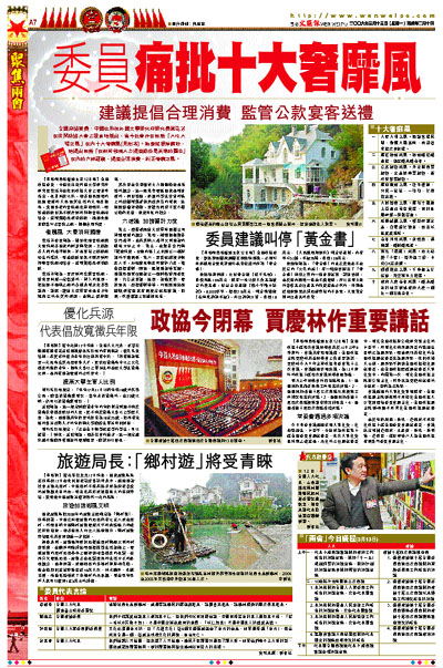 全國政協委員、中國社科院外國文學研究所研究員葉廷芳在此間政協大會上發言時指出,當今社會存在包括「大吃大喝之風」在內十大奢靡風(見附表)。為徹底根除腐敗,她提出包括「在教育領域大力提倡節儉是美德的觀念」在內的六條建議,提倡合理消費,糾正奢靡之風。