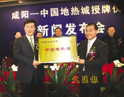 中國—咸陽地熱城」授牌儀式暨新聞發布會日前在京舉行。咸陽市委書記張立勇、代市長千軍昌從國土資源部和中礦聯領導手中接過金光閃閃的牌匾,這標誌著咸陽正式成為中國首個獲「中國地熱城」桂冠的城市。
