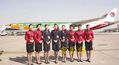 ■東航空中服務人員昨在「世博號」飛機前合影留念。 新華社