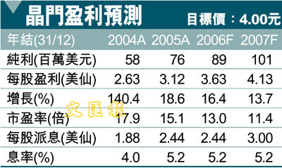 另外,公司積極拓展其手提電話顯視晶片的市場佔有率,相信預料集團未來之盈利可進一步上升。預測06年每股盈利將上升16%至3.63美元,07年將上升14%至4.13美元。