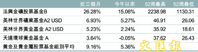 在美股標普500指數上周下跌的情況下,截至上周四的一星期,標普500下跌約0.83%,引發該星期黃金基金下跌8.41%。佔近今年以來榜首的的法興金礦股票基金,基金在2003、2004和2005年表現分別為41.15%、-7.96%及40.88%,基金標準差為31.19。基金地區分布為74%北美、8.46%英國、8.18%澳洲、6.46%非洲/中東及2.9%拉丁美洲。