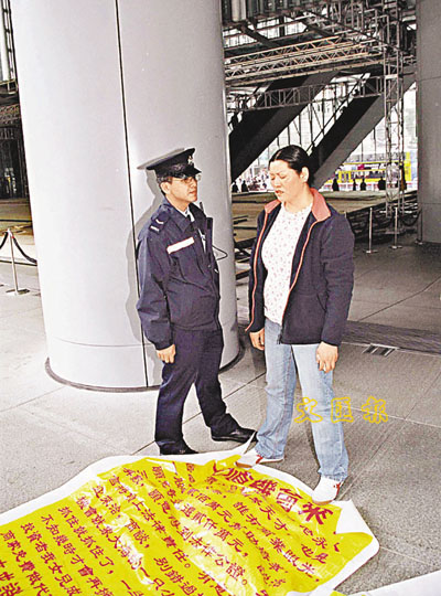 ■在中環匯豐銀行總行外以大橫額請求富人募捐的婦人,因衝出馬路曾被警干涉。