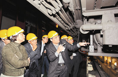 ■06年1月發生的「九鐵/東鐵列車底盤組件事故」是引致九鐵「兵變」事件的導火線。圖為環境運輸及工務局局長廖秀冬1月13日視察九鐵火炭車廠。右3即為當時九鐵署理行政總監黎文熹。 資料圖片