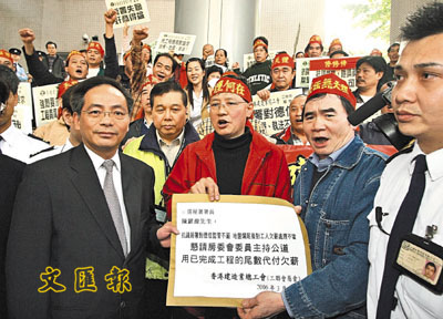 ■德信工人在房署總部門外示威請願,葉國謙(左)接收請願信。 本報記者羅蘭蓉 攝