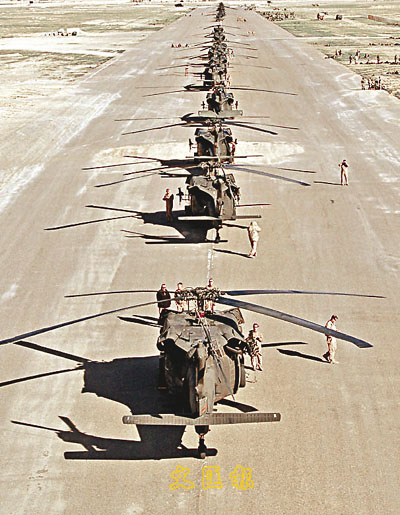 ■美軍在近日大規模空襲中,出動50架戰鬥直升機轟炸「基地」據點。 法新社